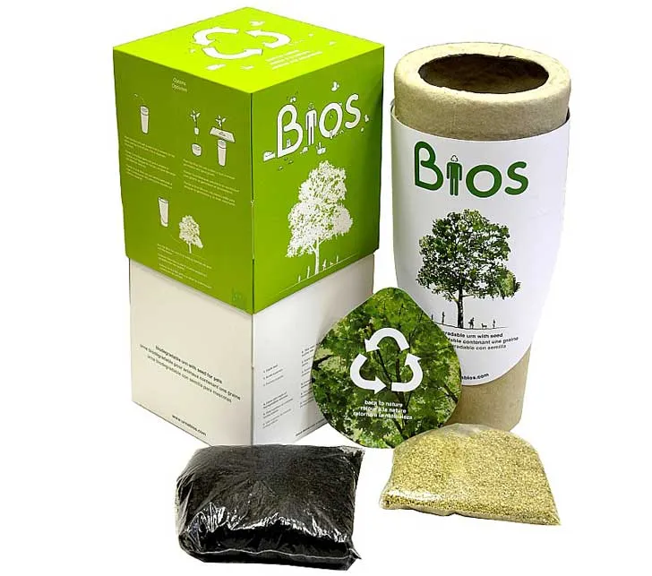 Gracias a su estructura, la urna Bios mantiene a la semilla separada de las cenizas. El árbol crece en el compartimiento superior de la urna, hasta que ésta empieza a degradarse. Luego, tanto la urna como su contenido se transforman en tierra fertilizante para el crecimiento del árbol.